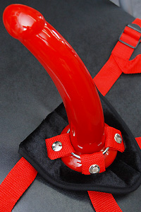 情熱的な真っ赤なペニスバンドです。当店で使用されている定番のペニスバンド「スタンドバイミー」よりも太めですが、素材が柔らかいので怖がらないで一度お試し頂きたいアイテムです。